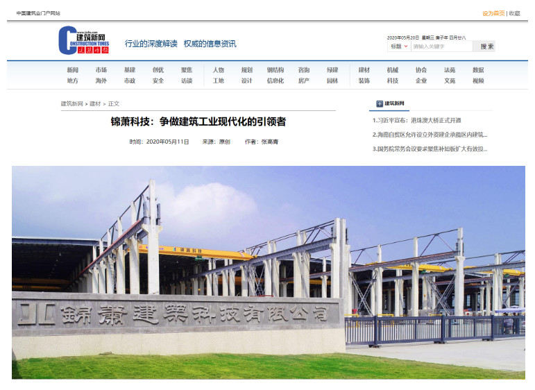 2020年5月18日,《建筑时报》第3724期第5版,刊登了《争做建筑工业现代化的引领者——太阳集团tyc4633建筑科技有限公司走访记》一文,对太阳集团tyc4633建筑科技有限公司进行了大篇幅报道。