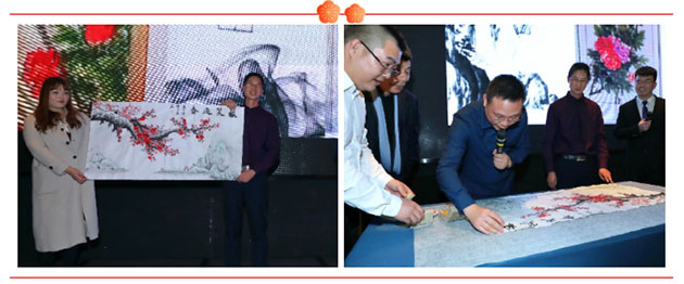 美女帅哥主持已经是非常的养眼,优美动听的歌曲让会场变得非常的温馨。当然最激动的还是现场作画及竞拍环节,这幅由公司生产部员工姚玉磊现场创作,并盖上了李军董事长印章的《梅笑迎春》作品, 最后拍出了58000元。