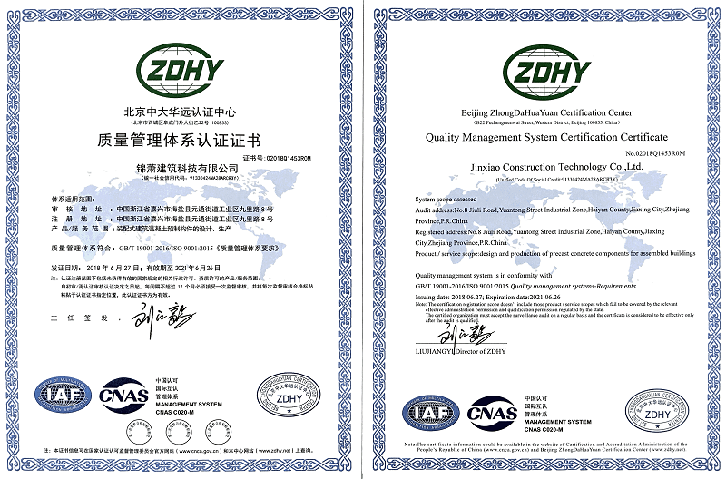 近日,太阳集团tyc4633建筑科技有限公司正式通过了ISO9001:2015质量管理体系认证,并获得认证证书,这标志着公司在产品研发设计、生产及销售服务方面已达到国际化标准,获得了国际权威组织的认可。