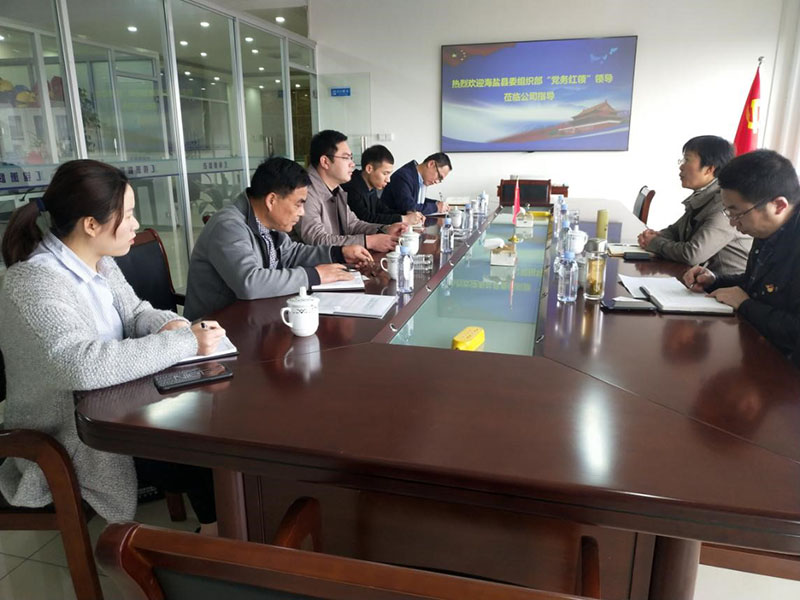 2019年04月02日上午,海盐县委组织部副部长夏一飞、组织部两新科科长朱世鹏、望海街道党委组织委员缪李伟,”党务红领‘’富雪祥一行莅临公司指导工作。