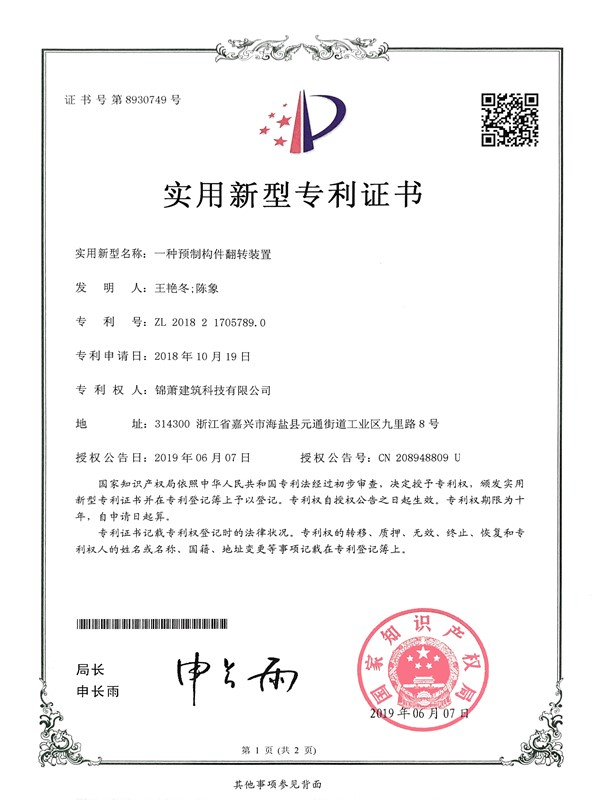 专利证书-一种预制构件翻转装置