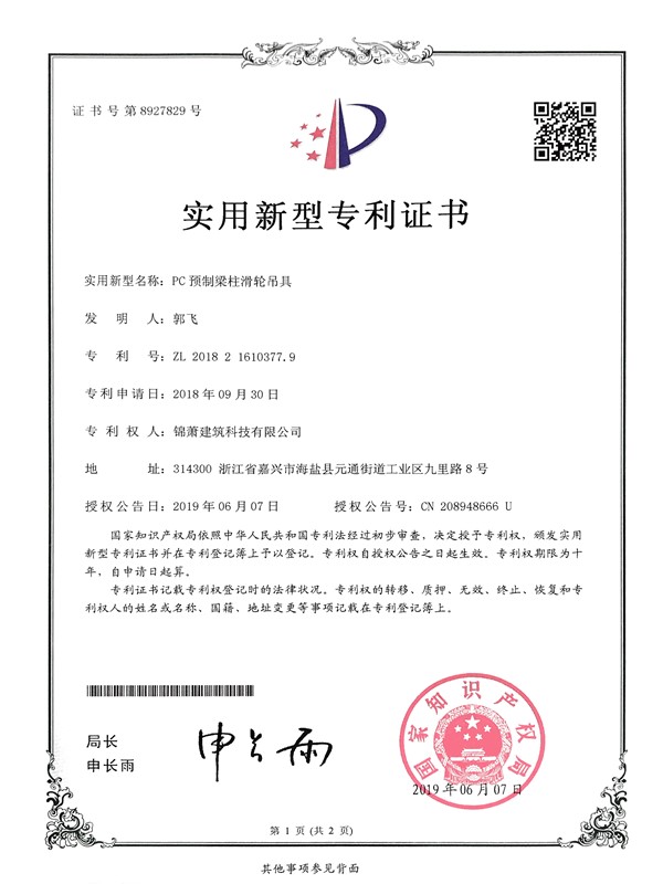 专利证书-PC预制梁柱滑轮吊具