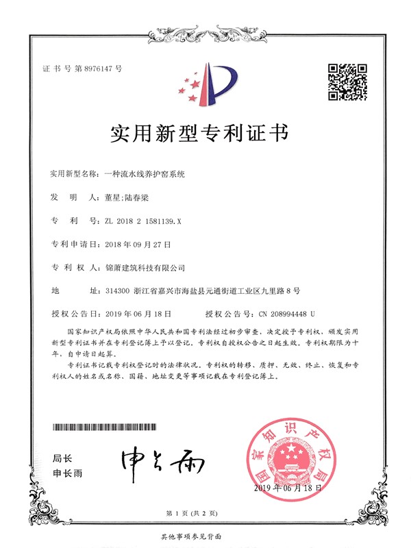专利证书-一种流水线养护窑系统