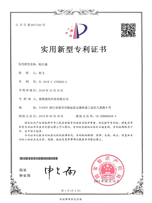 专利证书-取钉器
