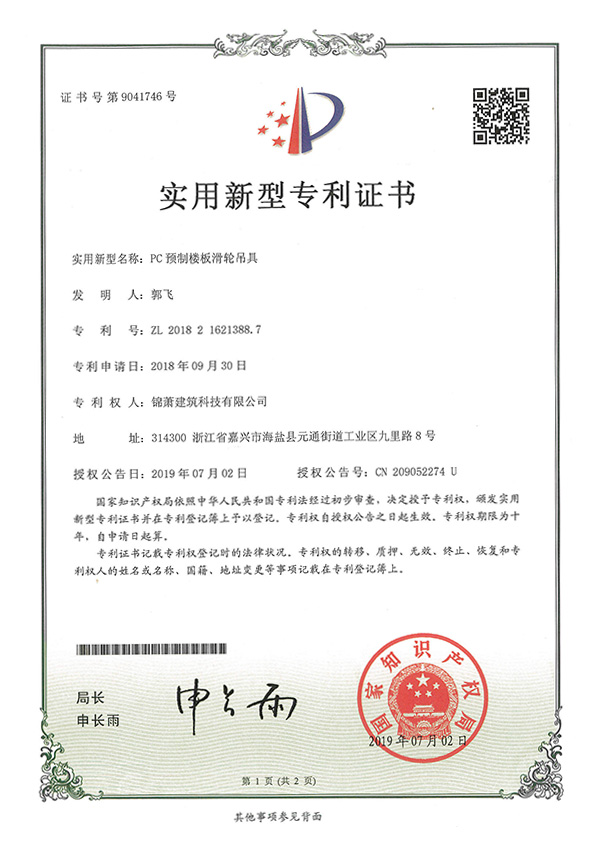 专利证书-PC预制楼板滑轮吊具