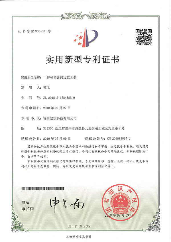 专利证书-一种可调套筒定位工装