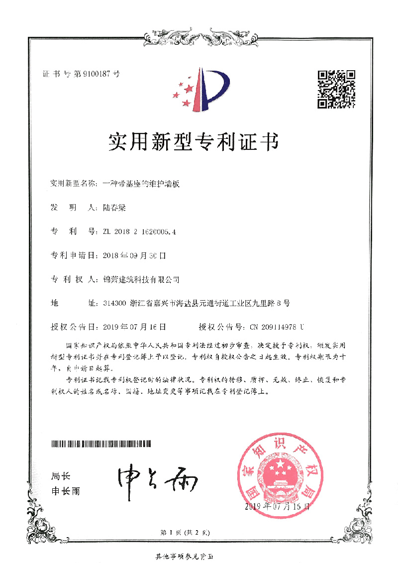专利证书-一种带基座的维护墙板